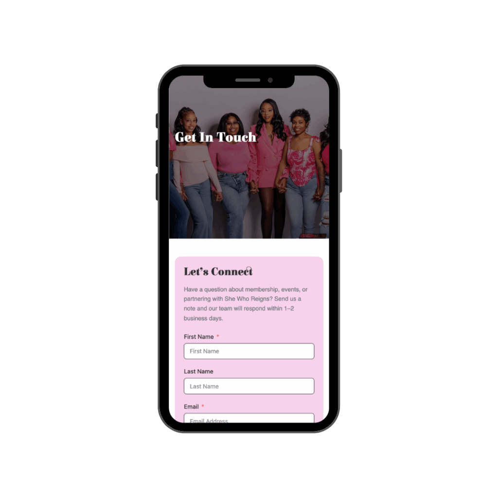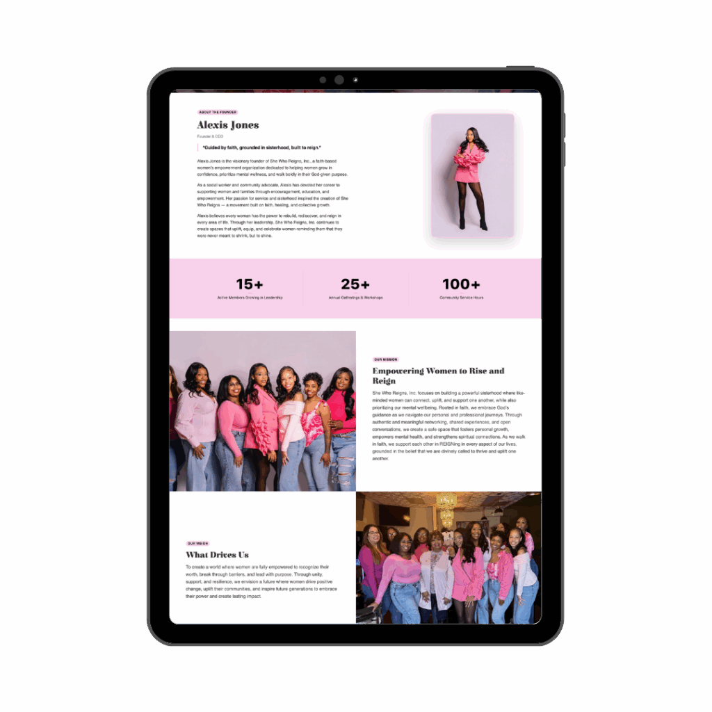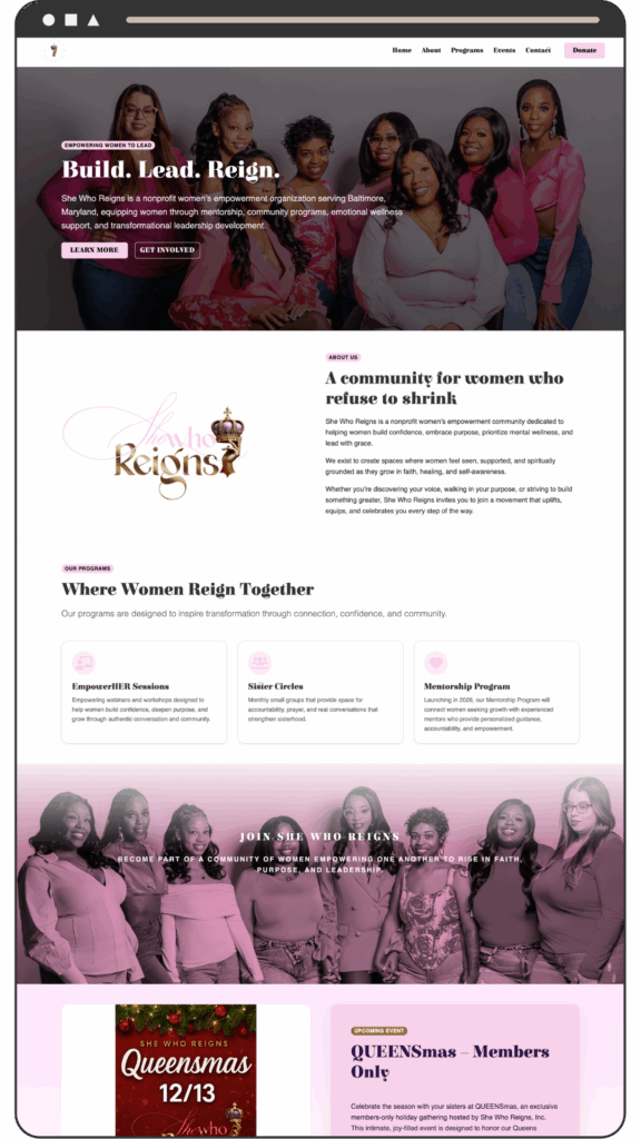 She Who Reigns came to us without an existing website and without a clear idea of what their digital presence should look like. They needed everything built from the ground up — structure, visuals, messaging, page flow, and a scalable foundation for future programs.